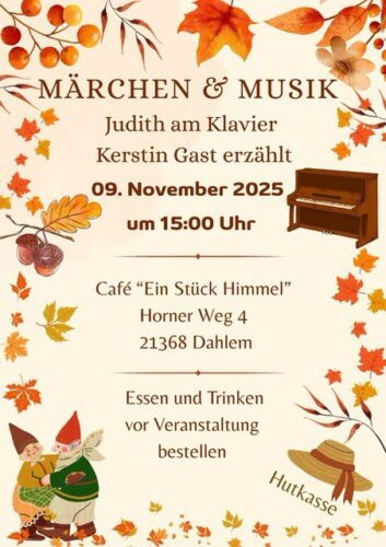 Tauchen Sie ein in eine märchenhafte Stunde voller Musik und Erzählkunst. Judith am Klavier und Kerstin Gast laden Sie zu einem Nachmittag ein, an dem Musik und Märchen zu einer warmen, herbstlichen Atmosphäre verschmelzen.
